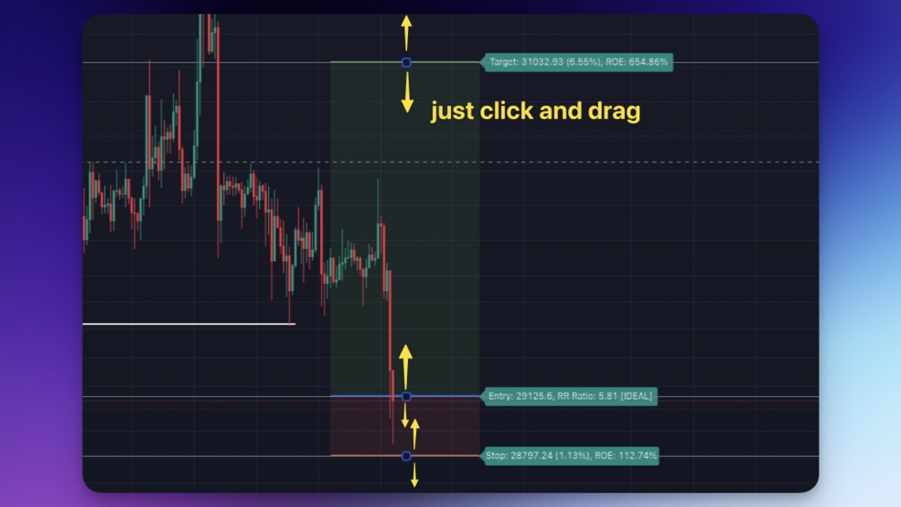 4. You can adjust the three prices (target, entry, and stop) by clicking any part of the indicator. There will be three dots in the middle of the chart window (align with three prices). Click that dots and drag them up/down to customize according to your wishes. The price order must be correct, for LONG direction the price order from the top is target-entry-stop. Vice versa for SHORT direction. There will be "SETUP ERROR" text in the top-right box if the price order is not correct.